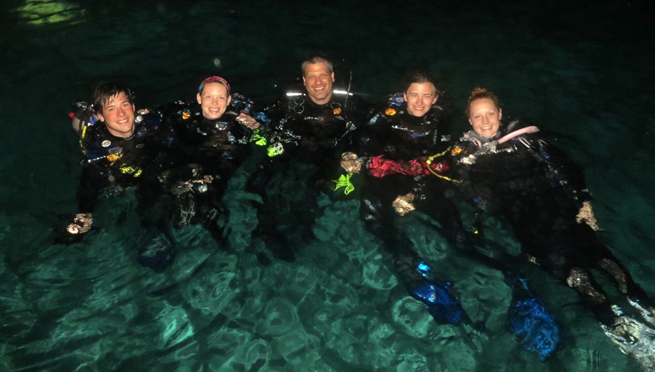 Dr. Dave Unger, (center) diving with students on a study abroad trip to Bonaire, Municipality of the Netherlands, in 2014. For Unger, combining diving with teaching his students is a match made in heaven. (Photo courtesy of Dave Unger.)