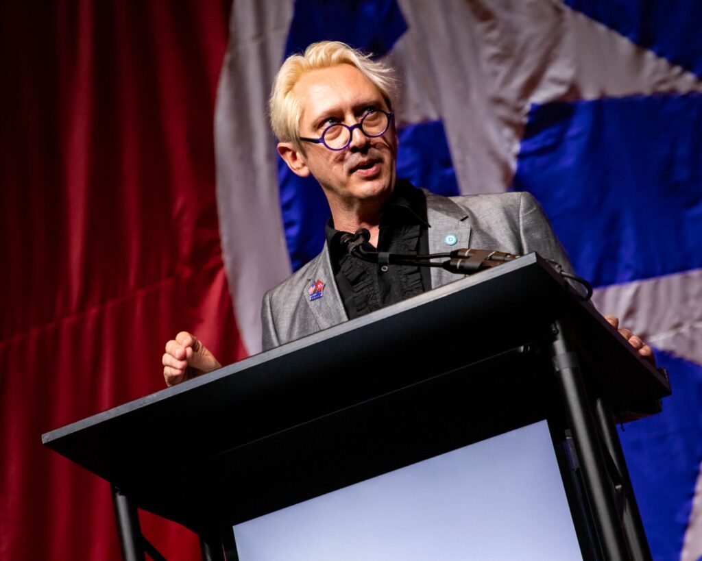 Dr. Nathan Higdon speaking as Vice Chair of the Tennessee Democratic Party. (Photo courtesy of Nathan Higdon.)