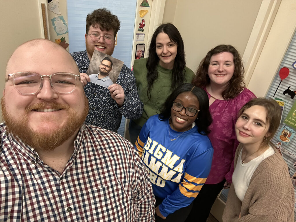 Residence Life professional staff pose for a selfie, holding a photo of Daniel Roselli (‘14), who was absent this day.