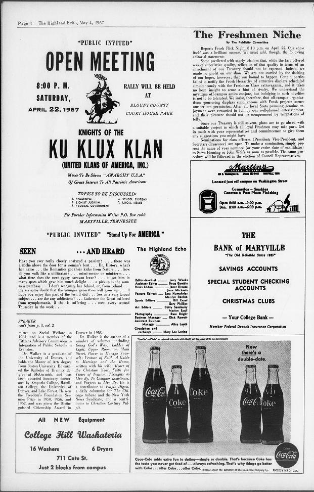 The Echo even published a flyer for one such KKK rally, essentially informing students of where not to go on Saturday, April 22, 1967.
