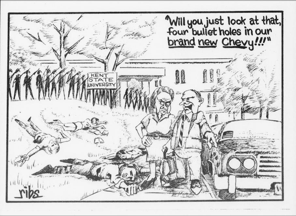 Political cartoon drawn by John Ribble (‘70) after the Kent State shootings in May, 1970