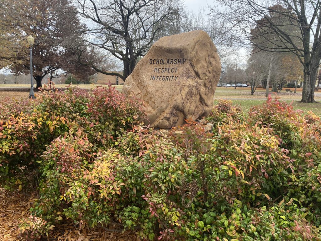 Shrubs around the Covenant stone change colors with the season. (Photo courtesy of Maddux Morse)