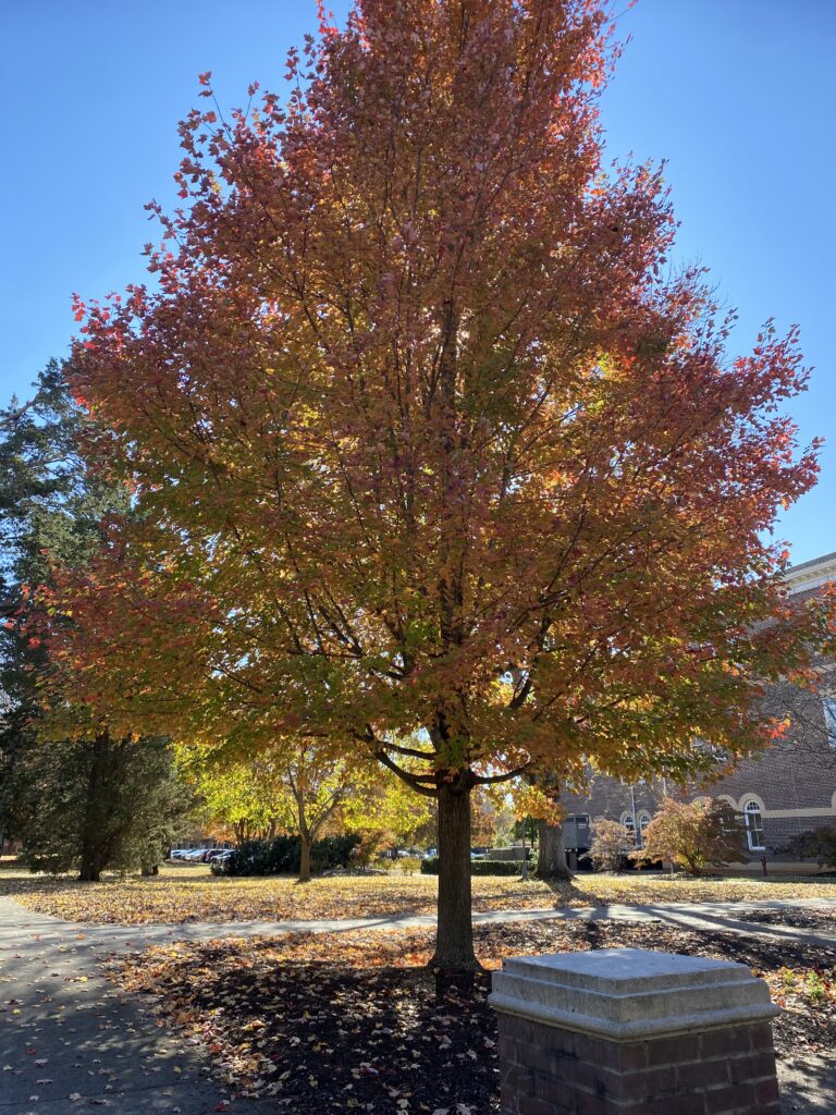 Two trees proudly display their vibrant red leaves behind the Clayton Center for the Arts. (Photo courtesy of Maddux Morse)