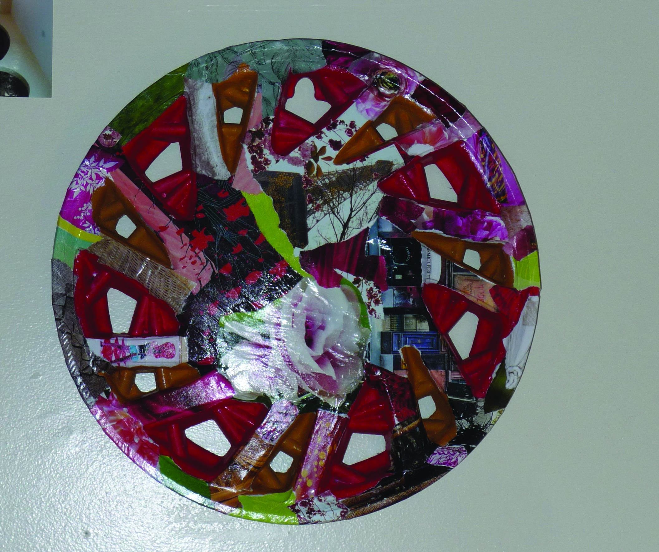 Brobst’s second project is a wall decoration – a collage of pictures using a hub cap she found as its base. Photo by Katie Brobst