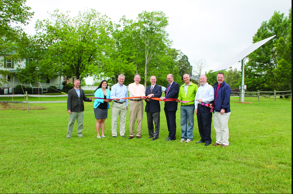 Members of the group responsible for securing the solar array pose with Bogart as he prepares to cut the ribbon, dedicating the array. Photo courtesy of the MC Flickr website
