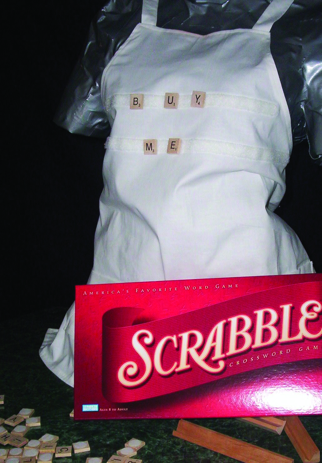 Kiewiet’s final creation is another apron, this time made out of some white material she found at a thrift shop and an old Scrabble game. Photo by Melissa Kiewiet