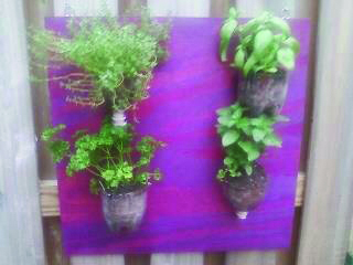 Kiewiet also created a hanging herb planter made with a piece of old plywood and some plastic two-liter bottles. Photo by Melissa Kiewiet