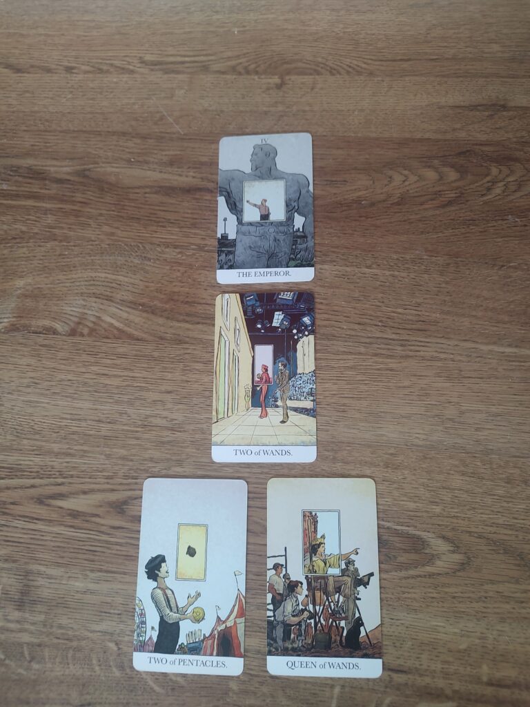 The future card revealed Two of Pentacles, with its clarifier being Queen of Wands. Pentacles commonly signify things in relation to the material world. This includes money, food, living spaces, the physical body, or even time. The Unveiled Tarot depicts a mime juggling a set of balls, with one in the center of the card appearing as a grenade. It possesses Mercurial, trickster god qualities, usually denoting high highs and low lows.