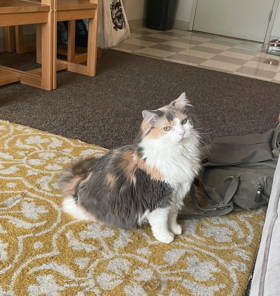 Cooper lives in Gibson Hall and spends her free time looking outside the window, begging for water at the sink, and sleeping during the day.