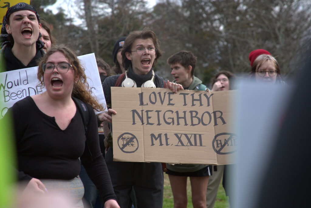 Jackie Manning (‘26) screams a powerful chant while holding up a sign that reads: Love Thy Neighbor.