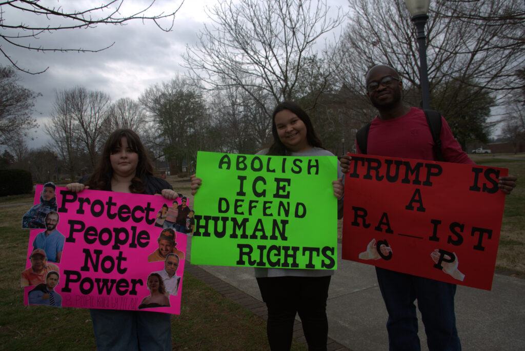 Katie Parnell (‘27), Kendra Young (‘27) and Andre Darko (‘26) pose for a picture holding their signs.