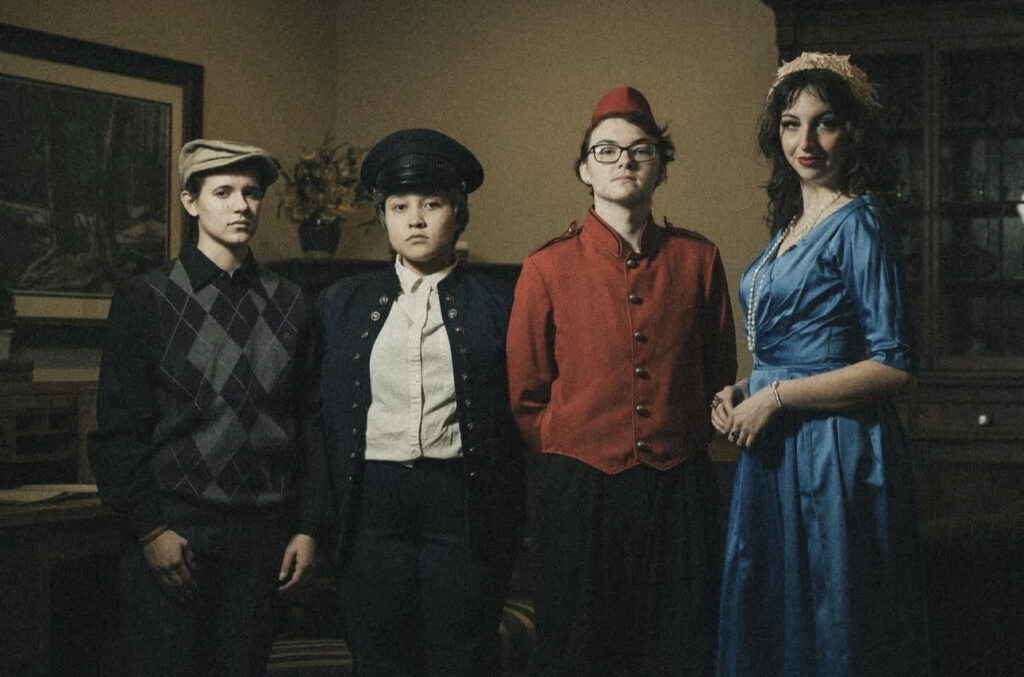 Madeline Spraul (‘28), Jada Greenle (‘28), Reid Goad (‘28), and Eden Carnes (‘27) pose for a press photo of APO’s production of Agatha Christie’s Murder on the Orient Express.
