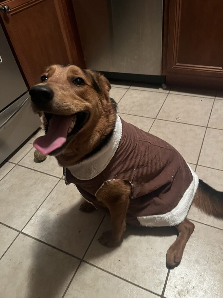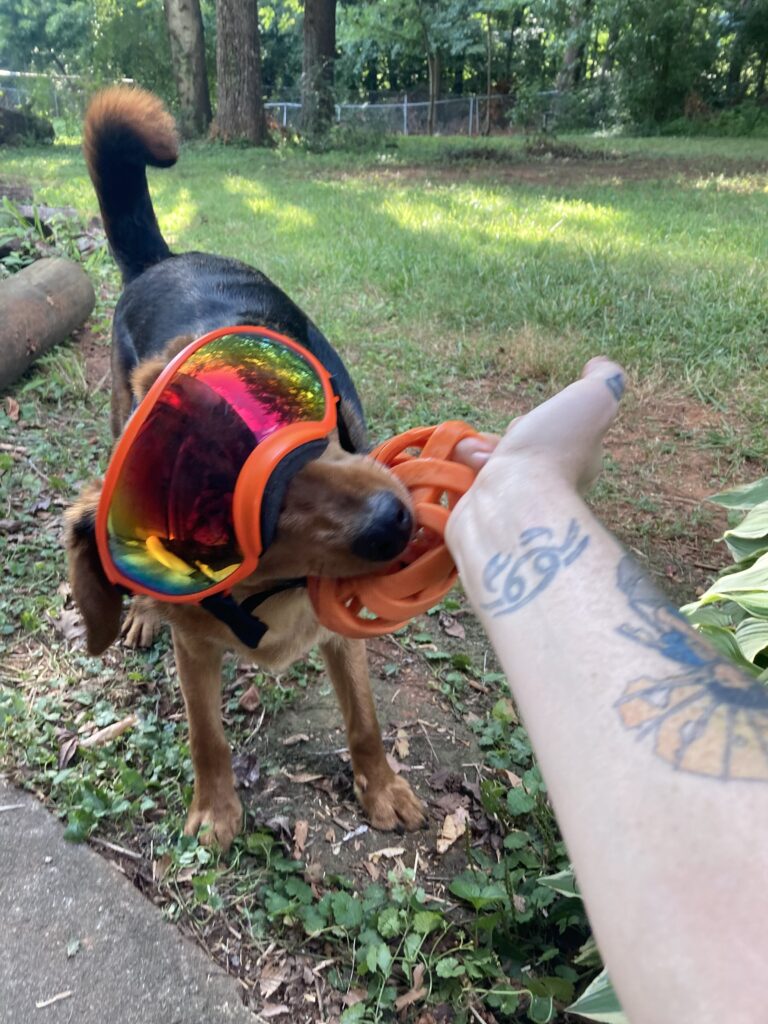 Batman wears his signature goggles as he plays with his chew toy. Photo courtesy of Kevin Grigsby (‘05).