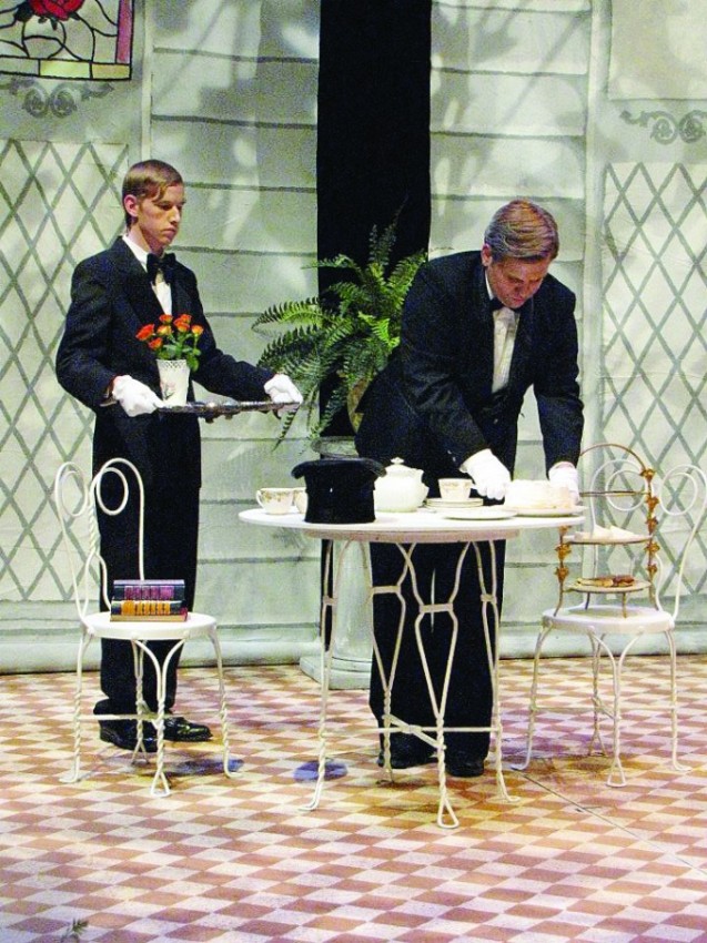 He goes by Jack or John when in a parental role around his ward, Cecily Cardew, played by junior Caitlin Campbell, but enjoys “revelries” as Ernest while in the city. Lady Bracknell, played by executive director of the Clayton Center for the Arts Robert Hutchens, interrupts the boys’ conversation with her arrival with her daughter, Gwendolen. She proceeds to interrogate Jack, refusing to allow the engagement of her daughter to him because of his dubious origins. Jack’s true family is a mystery. He was discovered in a handbag in a train station as an infant. His lack of proof of parentage is unacceptable to Lady Bracknell.