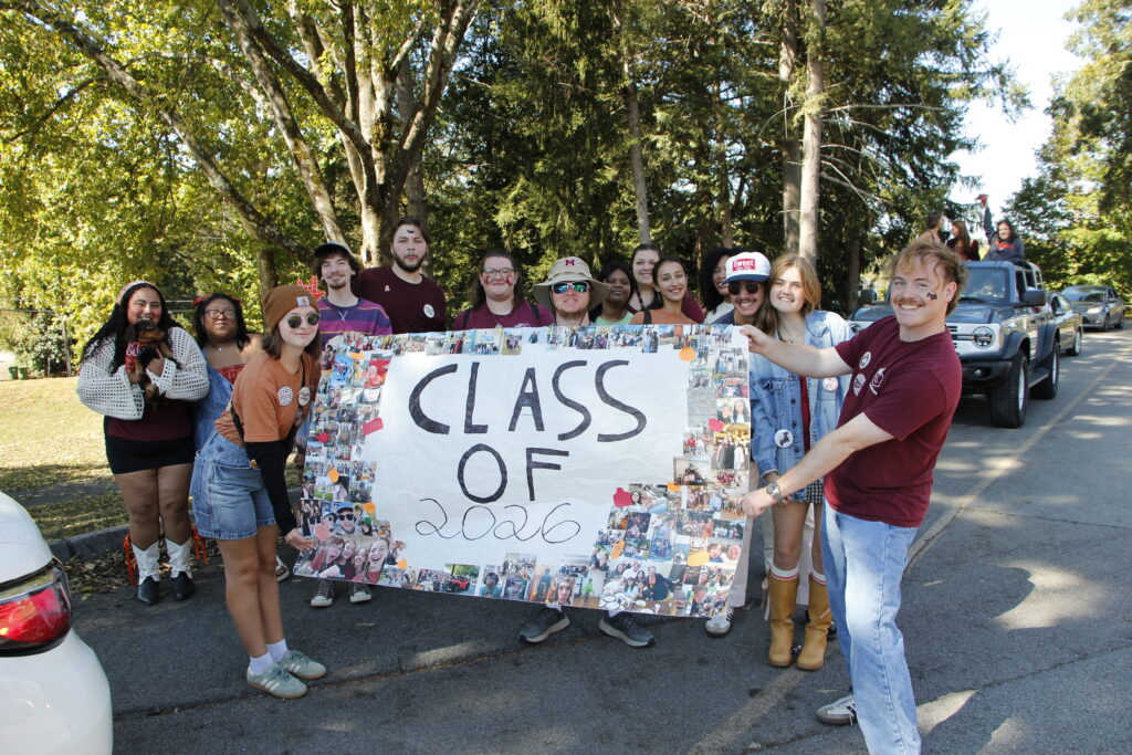 Class of 2026 seniors hold up a sign during the homecoming parade. Left to right: Mariam Jaber, J Ramirez, Megan Cooper, Reese Johnson, Trevor Morency, Myka Roberts, Isaac Cochrum, M’Kaylee Holley, Rukshona Isamova, Montina Jones, Jack Huggins, Mandalyn Webb, Josh Cornell. (Photo courtesy of Wes Hope)
