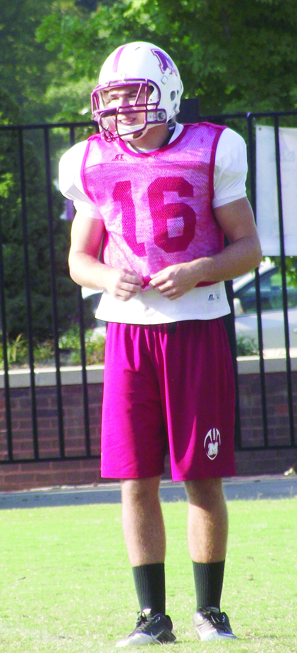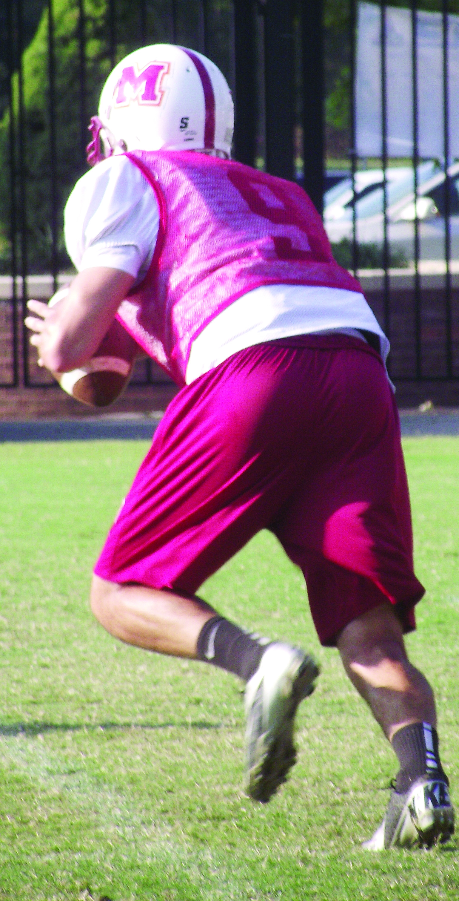 Eric Sisson playing quarterback during football practice.