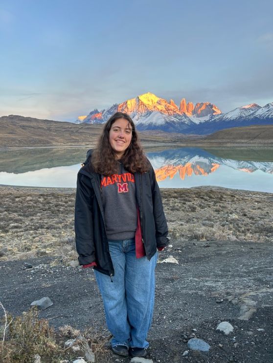 Clara Webster (‘26) represents MC in front of Andes Mountains, in Patagonia region of Chile. Photo courtesy of Clara Webster.