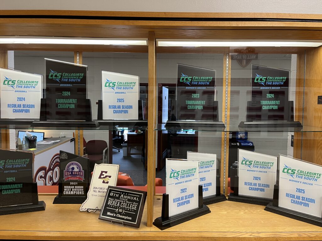 A trophy case displays awards won by Maryville in the CCS for Baseball, Softball, and Women’s Soccer. Photo courtesy of Eli Cauthorn