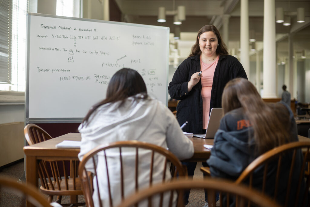 Hannah Phillips (’25), who originally planned to jump into Maryville College’s Master of Arts in Teaching as soon as she graduated, tutors two of her classmates earlier this year, before she graduated as one of the Outstanding Senior Award nominees.